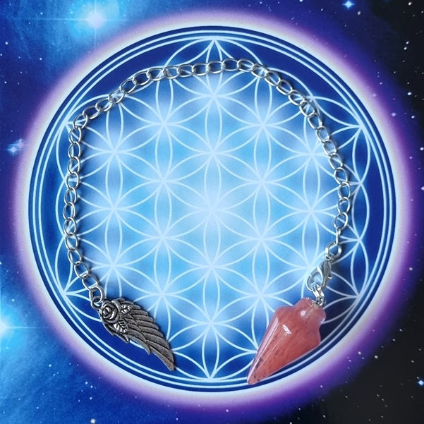 This Pendulum was created using a Simple Silver Chain, a Tibetan Silver Angel Wing Charm and a Red Obsidian Pendulum.  The clasp between the pendulum and cord allows for easy changes if so desired.