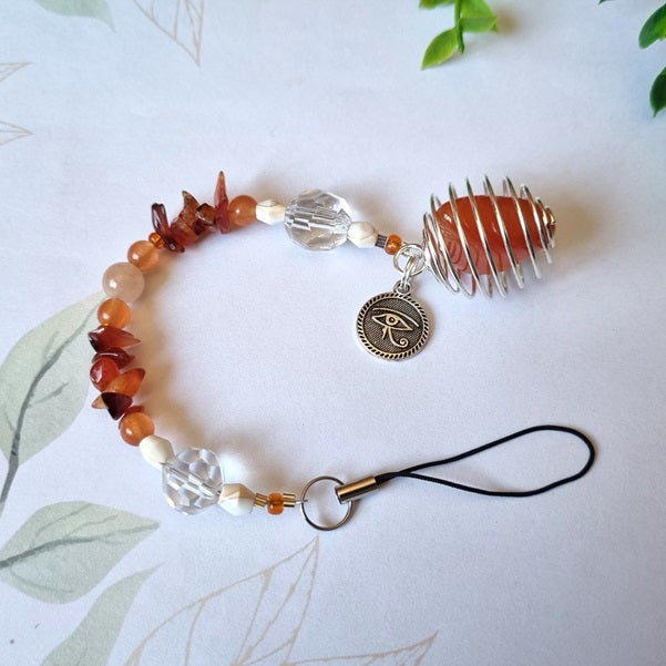 This Keeper Charm was created using Orange Malay Jade Beads, Agate Bead, Shell Beads, Clear Faceted Beads, and Carnelian Chip Beads, a Tibetan Silver Eye of Horus Charm, and a Carnelian Tumblestone (in a Tumblestone Holder).
