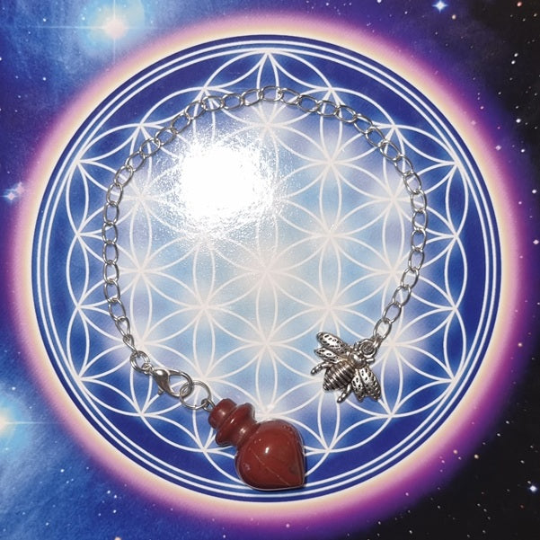 This Pendulum was created using a Simple Silver Chain, a Tibetan Silver Bee Charm and a Red Jasper Pendulum. The clasp between the pendulum and cord allows for easy changes if so desired.