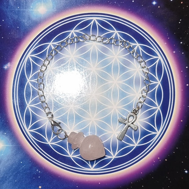 This Pendulum was created using a Simple Silver Chain, a Tibetan Silver Key of Life Charm and a Rose Quartz Pendulum.  The clasp between the pendulum and cord allows for easy changes if so desired.