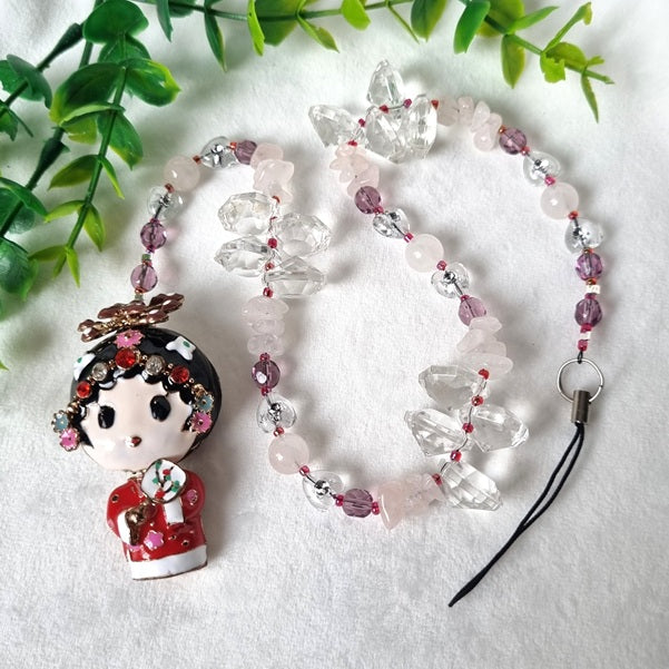 Rose Quartz Beads and Rose Quartz Chip Beads, along with dark pink faceted beads & small heart shaped beads, have been combined with a Painted Doll Charm, to remind us that within our hearts we have the capability of empathy and love.