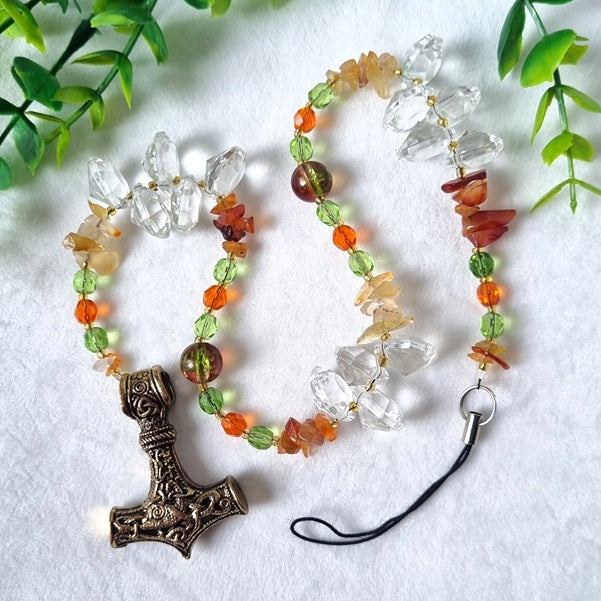 Carnelian Chip Beads, Agate Chip Beads, Green/Red Glass Beads and green and orange faceted beads, have been combined with a brass Thor’s Hammer Charm, to ensure the well-being of all.