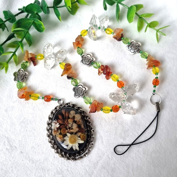 Carnelian Chip Beads and Tibetan Silver Flower Beads, along with Orange, Green and Yellow Faceted Beads, have been combined with a Charm of Wildflowers preserved in resin, to help us keep connected to all that is nature.